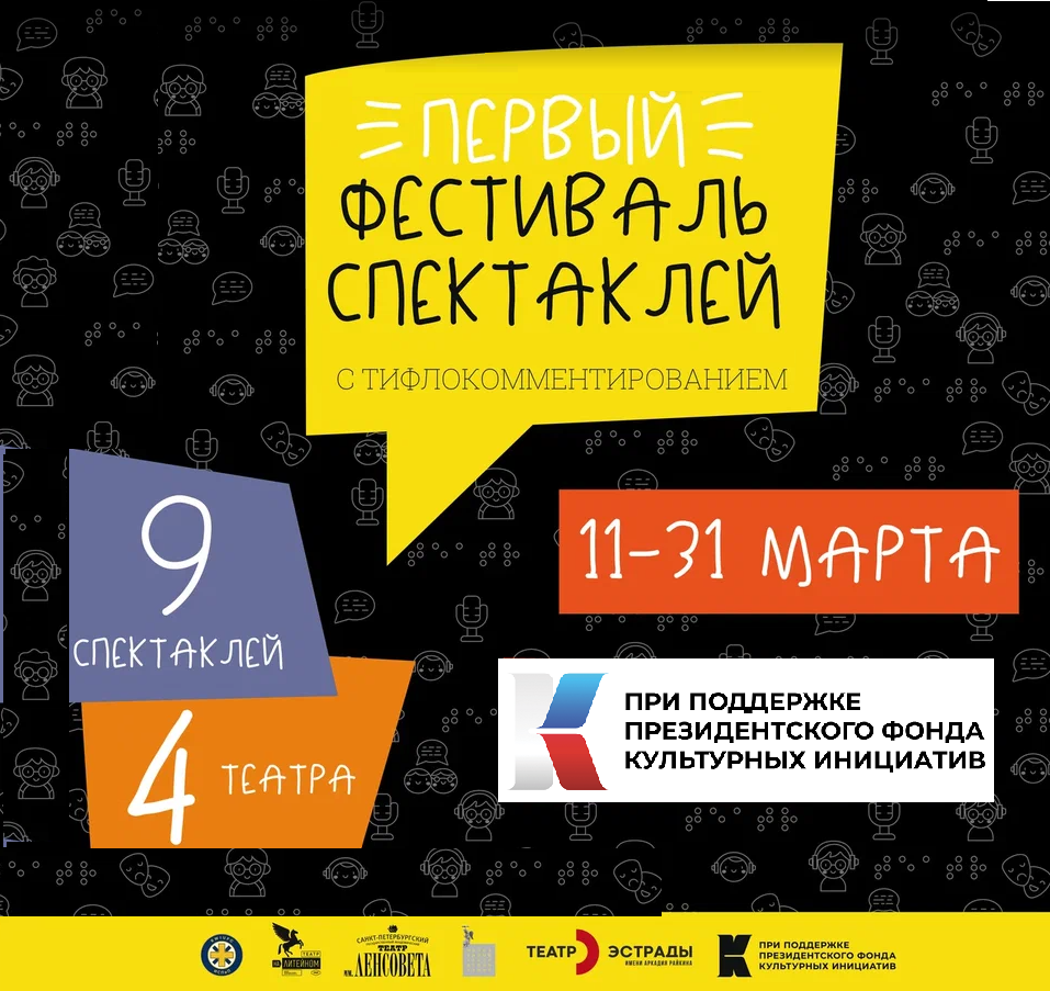 11-31 марта 2022 в Санкт-Петербурге состоялся Первый фестиваль спектаклей с тифлокомментированием, организованный Институтом специальной педагогики и психологии при поддержке Президентского фонда культурных инициатив