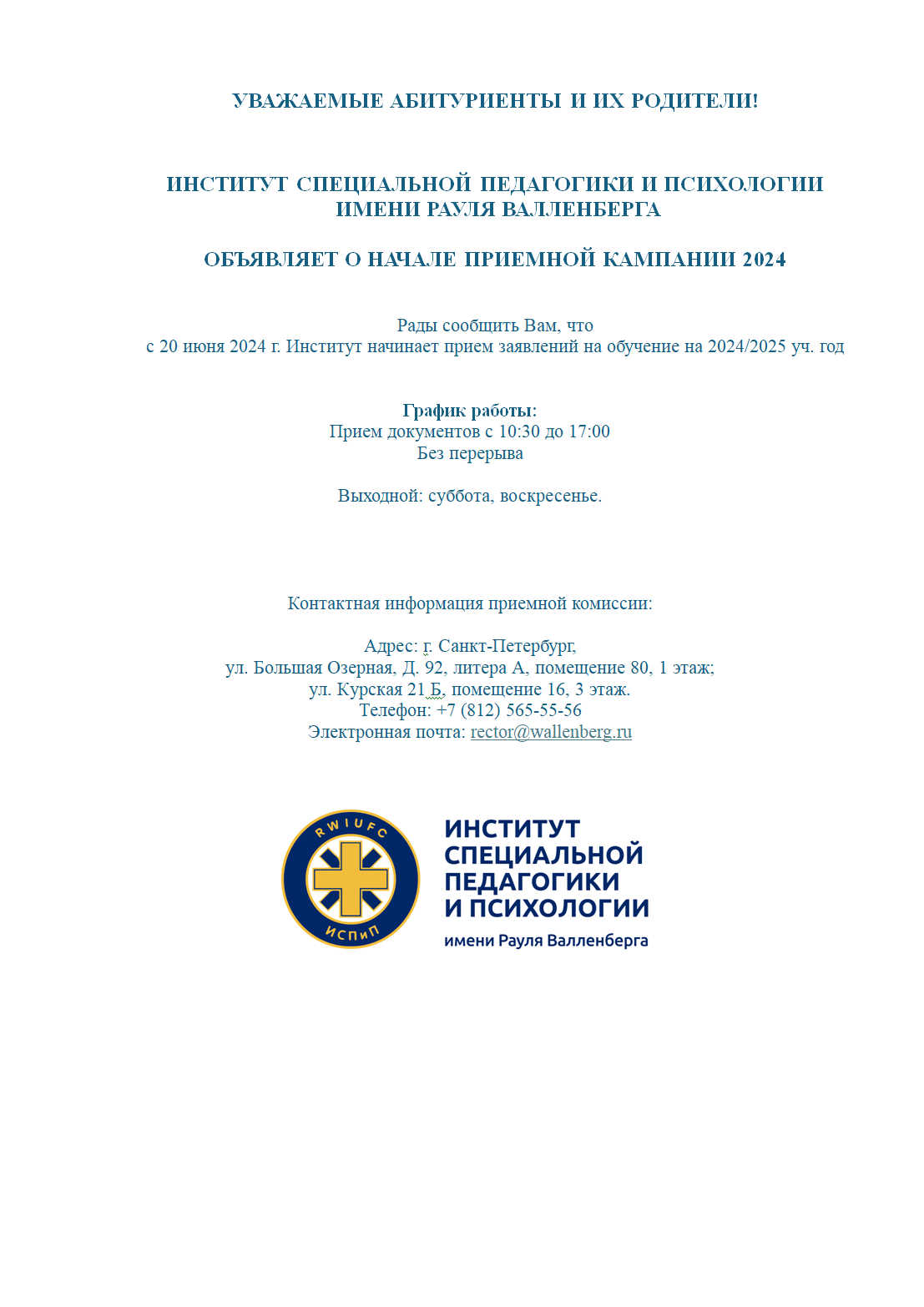С 20 июня 2024 г. Институт начинает прием заявлений на обучение на 2024/2025 уч. год